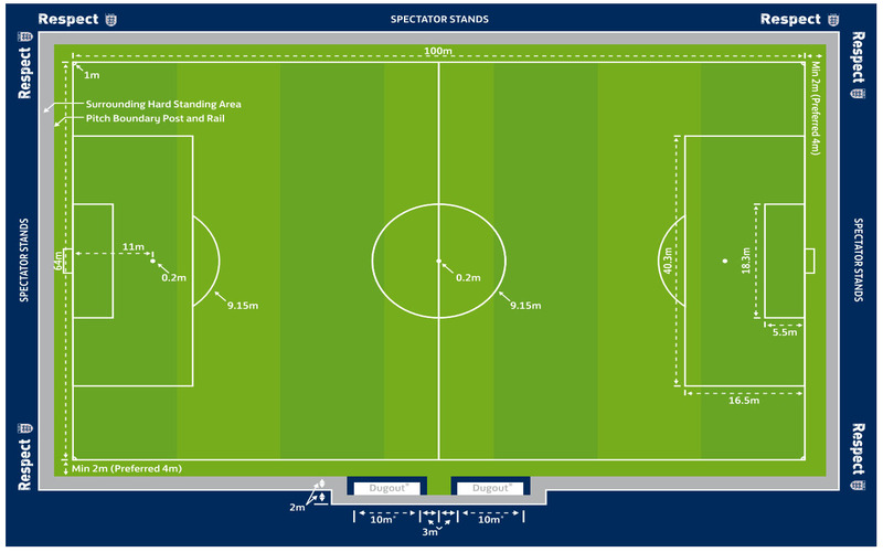 • Chiều dài sân thi đấu nằm trong khoảng từ 100 đến 110 mét. Đây là kích thước phù hợp để cầu thủ có đủ không gian triển khai các chiến thuật tấn công, phòng ngự và chuyển đổi trạng thái. Các sân nhỏ hơn sẽ khiến tốc độ trận đấu nhanh hơn nhưng giảm sự linh hoạt chiến thuật, trong khi sân quá lớn sẽ tốn nhiều sức lực và giảm chất lượng thi đấu.